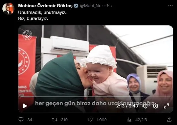 Aile ve Sosyal Hizmetler Bakanı Mahinur Özdemir Göktaş, "Yüzyılın felaketini, yüzyılın fedakarlıklarıyla atlatıyoruz. Yaralarımızı hep beraber sardık, sarmaya devam edeceğiz." ifadelerini kullandı.