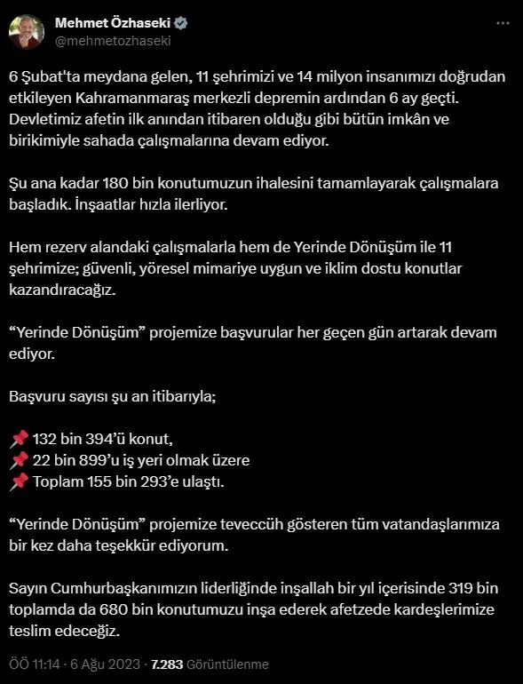 "Şu ana kadar 180 bin konutumuzun ihalesini tamamlayarak çalışmalara başladık. İnşaatlar hızla ilerliyor. Hem rezerv alandaki çalışmalarla hem de yerinde dönüşüm ile 11 şehrimize, güvenli, yöresel mimariye uygun ve iklim dostu konutlar kazandıracağız. Yerinde Dönüşüm Projemize başvurular her geçen gün artarak devam ediyor. Başvuru sayısı şu an itibarıyla, 132 bin 394'ü konut, 22 bin 899'u iş yeri olmak üzere toplam 155 bin 293'e ulaştı. Projemize teveccüh gösteren tüm vatandaşlarımıza bir kez daha teşekkür ediyorum. Sayın Cumhurbaşkanımızın liderliğinde inşallah bir yıl içerisinde 319 bin toplamda da 680 bin konutumuzu inşa ederek afetzede kardeşlerimize teslim edeceğiz."