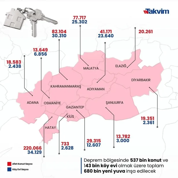 "Hatay 220 bin 66, Kahramanmaraş 82 bin 104, Malatya 77 bin 717, Adıyaman 41 bin 171, Gaziantep 29 bin 315, Elazığ 20 bin 261, Diyarbakır 19 bin 351, Adana 18 bin 583, Şanlıurfa 13 bin 782, Osmaniye 13 bin 646 konut, Kilis 733."