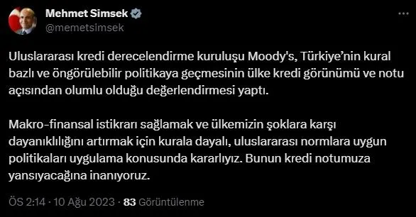 Şimşek, "Uluslararası kredi derecelendirme kuruluşu Moody's, Türkiye'nin kural bazlı ve öngörülebilir politikaya geçmesinin ülke kredi görünümü ve notu açısından olumlu olduğu değerlendirmesi yaptı. Makro-finansal istikrarı sağlamak ve ülkemizin şoklara karşı dayanıklılığını artırmak için kurala dayalı, uluslararası normlara uygun politikaları uygulama konusunda kararlıyız. Bunun kredi notumuza yansıyacağına inanıyoruz." dedi.