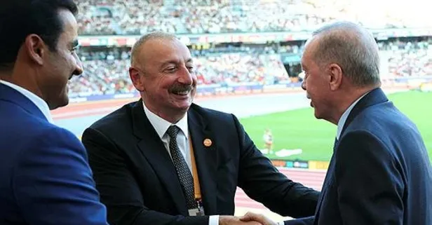 Budapeşte Dünya Atletizm Şampiyonası 2023 Erkekler 100 metre yarışı finalini izleyen Başkan Erdoğan, stadyumda Azerbaycan Cumhurbaşkanı İlham Aliyev ve Katar Emiri Şeyh Temim bin Hamed Al Sani ile sohbet etti.