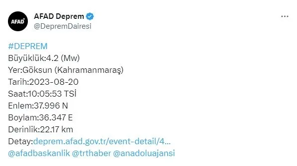 Afet ve Acil Durum Yönetimi Başkanlığının (AFAD) sitesinde yer alan bilgiye göre, merkez üssü Kahramanmaraş'ın Göksun ilçesi olan 4,2 büyüklüğünde sarsıntı kaydedildi.