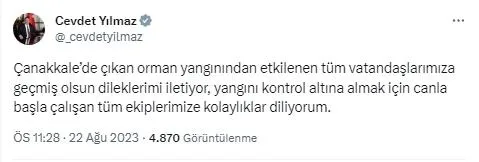 Cumhurbaşkanı Yardımcısı Cevdet Yılmaz, Çanakkale'deki orman yangınından etkilenenlere geçmiş olsun, yangın söndürme çalışmalarına katılanlara ise kolaylıklar diledi.
