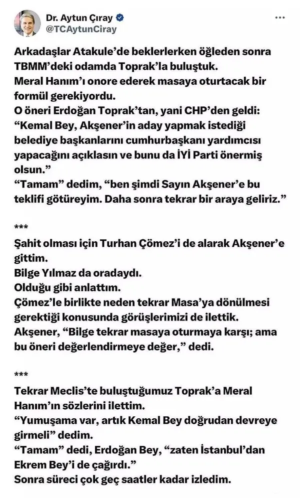 Aytun Çıray, Twitter hesabından 3 Mart ile 6 Mart arasında yaşanan ve bizzat içinde bulunduğu Akşener'in masaya nasıl oturtulduğunu tarih tarih şöyle anlattı: