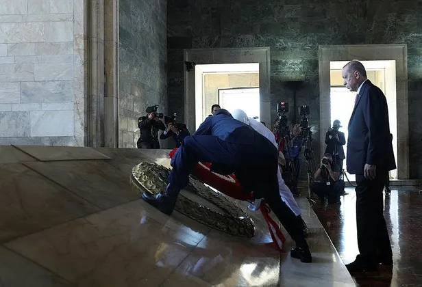 Erdoğan, Atatürk'ün mozolesine ay yıldız motifli çelengi bıraktı. Saygı duruşunun ardından İstiklal Marşı okundu.