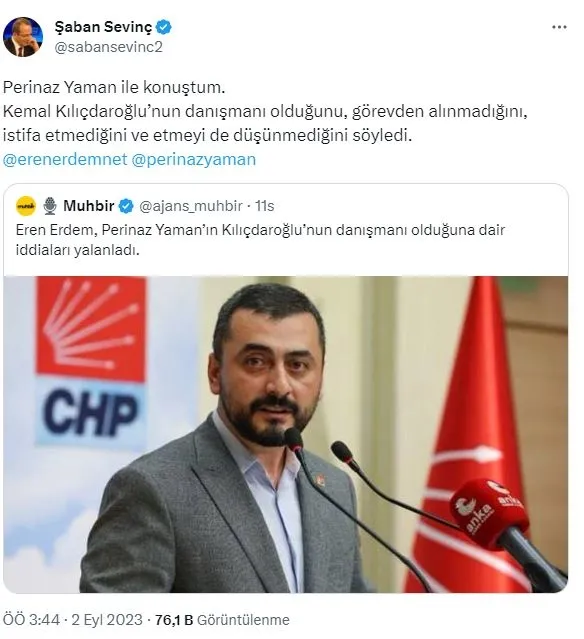 Eren Erdem'in açıklamalarının ardından bir paylaşımda bulunan CHP yandaşı Gazeteci Şaban Sevinç, "Perinaz Yaman ile konuştum. Kemal Kılıçdaroğlu'nun danışmanı olduğunu, görevden alınmadığını, istifa etmediğini ve etmeyi de düşünmediğini söyledi." ifadelerini kullandı.