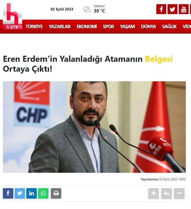 Kılıçdaroğlu'nun Perinaz Mahpeyker Yaman'ı ataması büyük tepkilere neden olurken, CHP'nin trol başı Eren Erdem canlı yayından nasıl savunacağını şaşırdı. Yaman'ın atamasını "MYK sonrası böyle bir isim yok" diyerek geçiştirmeye çalışan Eren Erdem göz göre yalan söyledi. Nitekim CHP ve Atatürk düşmanı Perinaz Mahpeyker Yaman'ın ataması 26.05.2023 tarihinde gerçekleşmişti.