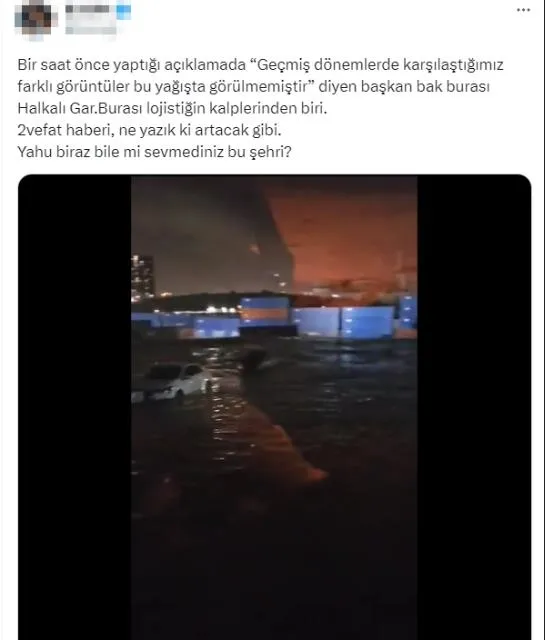 Bir sosyal medya kullanıcı ise İmamoğlu'na bu sözler tepki gösterdi: "Bir saat önce yaptığı açıklamada "Geçmiş dönemlerde karşılaştığımız farklı görüntüler bu yağışta görülmemiştir" diyen başkan bak burası Halkalı Gar.Burası lojistiğin kalplerinden biri. 2 vefat haberi, ne yazık ki artacak gibi. Yahu biraz bile mi sevmediniz bu şehri?"