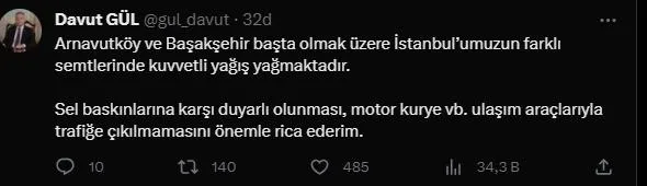 İstanbul Valisi Davut Gül, sosyal medya hesabından yaptığı paylaşımda, Arnavutköy ve Başakşehir başta olmak üzere İstanbul'un farklı semtlerinde kuvvetli yağış olduğunu belirterek, su baskınlarına karşı dikkatli olunmasını istedi. Vali Gül ayrıca, motosiklet gibi ulaşım araçlarıyla trafiğe çıkılmaması uyarısında bulundu.