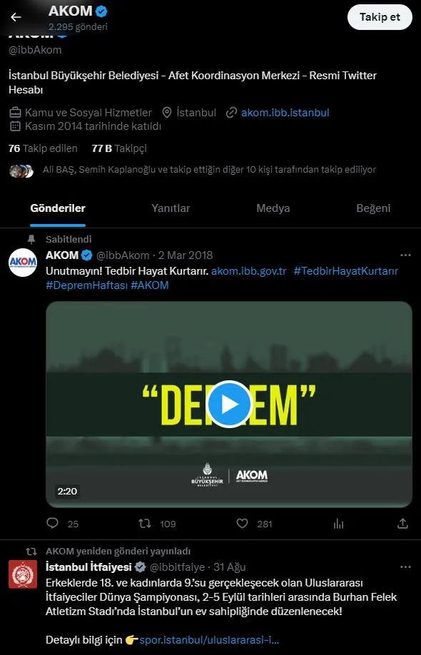 Öte yandan İstanbul'u sel götürürken, CHP'li İBB'ye bağlı Afet Koordinasyon Merkezi AKOM'un İstanbul'u uyarmak yerine, en son 5 gün önce etkinlik paylaşımı yaptığı tespit edildi. İstanbul'da son birkaç saattir yaşanan sel felaketi ile ilgili de herhangi bir uyarı paylaşımı gerçekleşmedi.