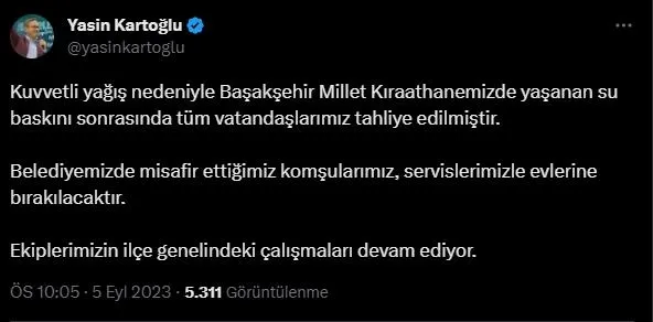 Başakşehir Millet Kütüphanesi'nde yağış nedeniyle içeridekilerin mahsur kaldığı ihbarı üzerine bölgeye itfaiye ekipleri sevk edildi. Başakşehir Belediye Başkanı Yasin Kartoğlu, sosyal medyadan yaptığı açıklamada, "Kuvvetli yağış nedeniyle Başakşehir Millet Kıraathanemizde yaşanan su baskını sonrasında tüm vatandaşlarımız tahliye edilmiştir. Belediyemizde misafir ettiğimiz komşularımız, servislerimizle evlerine bırakılacaktır. Ekiplerimizin ilçe genelindeki çalışmaları devam ediyor." ifadelerini kullandı.