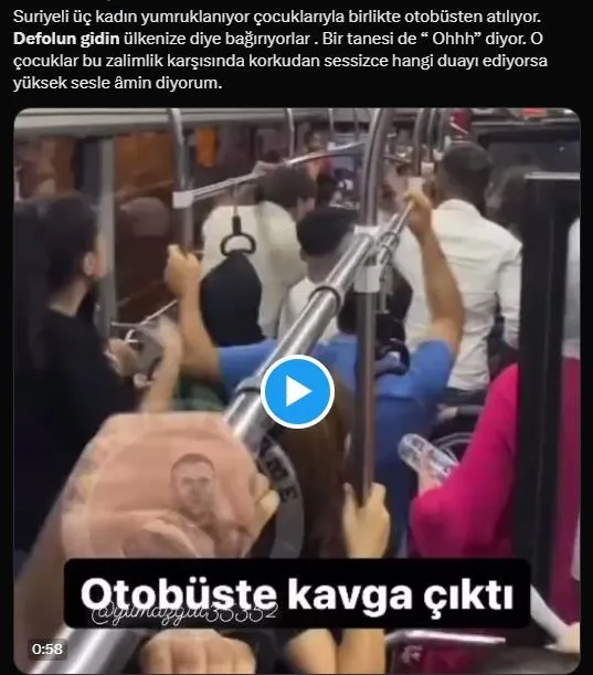 Suriyeli üç kadın yumruklanıyor çocuklarıyla birlikte otobüsten atılıyor. Defolun gidin ülkenize diye bağırıyorlar . Bir tanesi de " Ohhh" diyor. O çocuklar bu zalimlik karşısında korkudan sessizce hangi duayı ediyorsa yüksek sesle âmin diyorum.