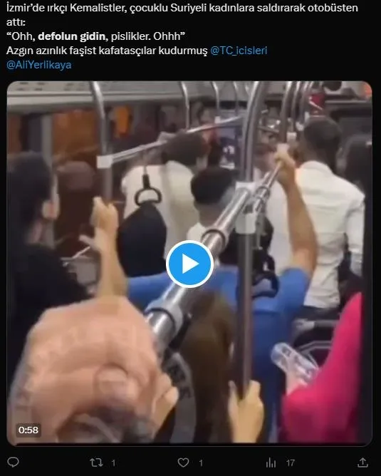 İzmir'de ırkçı Kemalistler, çocuklu Suriyeli kadınlara saldırarak otobüsten attı: "Ohh, defolun gidin, pislikler. Ohhh" Azgın azınlık faşist kafatasçılar kudurmuş.