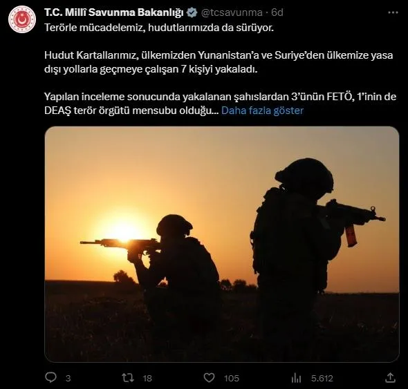 MSB'den yapılan açıklamada, "Hudut Kartallarımız, ülkemizden Yunanistan'a ve Suriye'den ülkemize yasa dışı yollarla geçmeye çalışan 7 kişiyi yakaladı. Yapılan inceleme sonucunda yakalanan şahıslardan 3'ünün FETÖ, 1'inin de DEAŞ terör örgütü mensubu olduğu belirlendi." denildi.