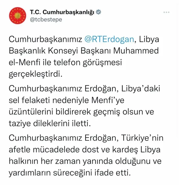 Başkan Recep Tayyip Erdoğan, Libya Başkanlık Konseyi Başkanı Muhammed el-Menfi ile telefon görüşmesi gerçekleştirdi.