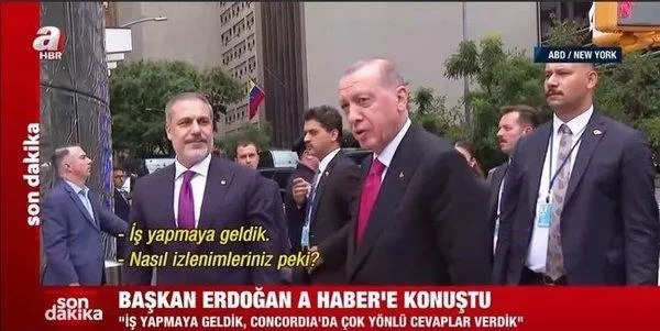 A Haber Muhabiri Rüya Akkuş'un kendisine yönelttiği "Programınız çok yoğun, sizi takip etmekte zorlanıyoruz" ifadesinin ardından Başkan Erdoğan "İş yapmaya geldik" dedi. Akkuş'un Concordia Zirvesindeki çok yönlü sorulara dikkat çekmesinin ardından Başkan Erdoğan, "Çok yönlü cevaplar verdik" ifadelerini kullandı.
