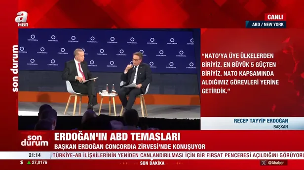 Birleşmiş Milletler Genel Kuruluna katılmak üzere New York'ta bulunan Başkan Erdoğan, Sheraton New York Times Square Hotel'de düzenlenen Concordia Zirvesi kapsamında soruları yanıtladı.