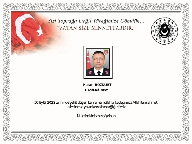 Milli Savunma Bakanlığı (MSB), şehit Jandarma Astsubay Kıdemli Başçavuş Hasan Bozkurt için taziye mesajı yayımladı.