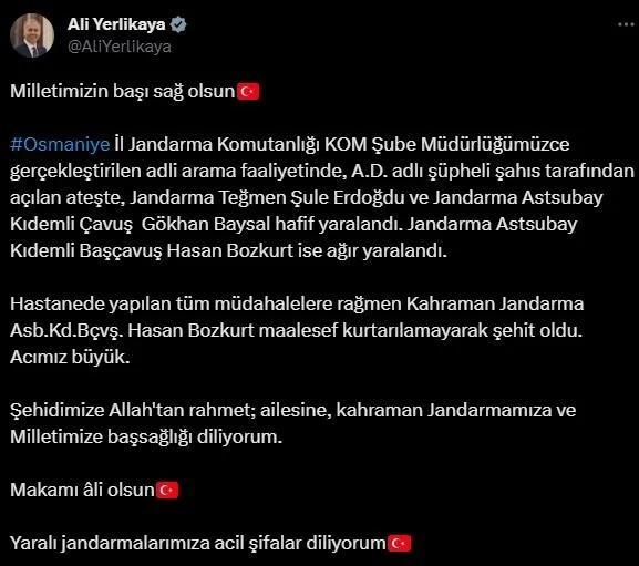 Son dakika haberi! Osmaniye'de bir evde jandarma tarafından yapılan uyuşturucu aramasında evdeki şüphelinin açtığı ateş sonucu 1 astsubay şehit oldu, 2 asker hafif yaralandı. Şüpheli sağ olarak ele geçirildi. İçişleri Bakanı Ali Yerlikaya, şehit olan ve yaralanan askerlerin kimlik bilgilerini sosyal medya hesabından açıkladı. Yerlikaya, "Acımız büyük. Şehidimize Allah'tan rahmet; ailesine, kahraman Jandarmamıza ve Milletimize başsağlığı diliyorum. Makamı âli olsun. Yaralı jandarmalarımıza acil şifalar diliyorum" ifadelerini kullandı.