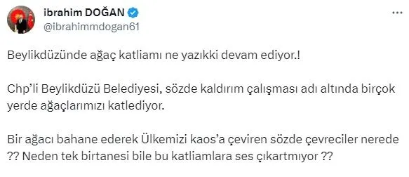 O anları sosya medya hesabından paylaşan AK Parti Beylikdüzü İlçe Başkanlığı YK Üyesi İbrahim Doğan, "Beylikdüzünde ağaç katliamı ne yazıkki devam ediyor! CHP'li Beylikdüzü Belediyesi, sözde kaldırım çalışması adı altında birçok yerde ağaçlarımızı katlediyor." ifadelerini kullandı.