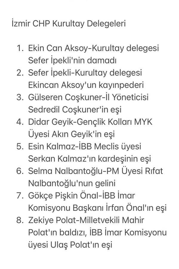 Büyük kurultayda CHP Genel Başkanı'nı seçmek üzere oy kullanacak İzmir delegelerinin çoğu, yine başka bir CHP'linin akrabası olması sayesinde bu ünvanı elde etmiş oldu.