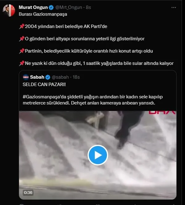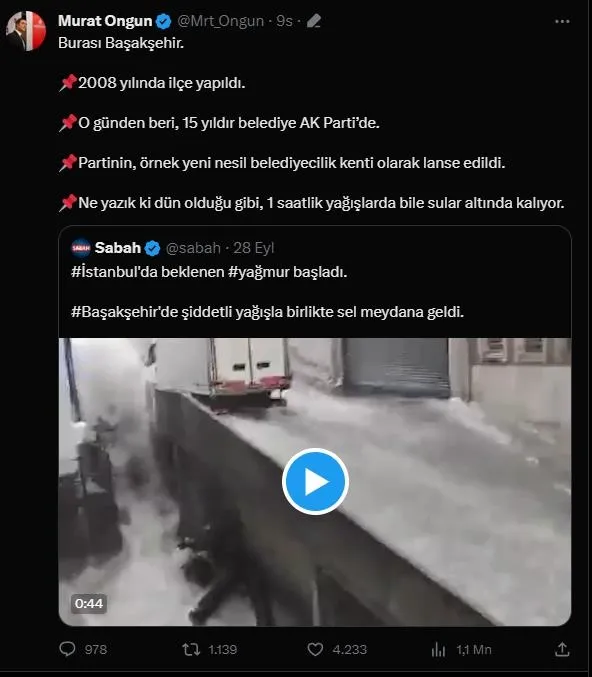 Son dakika haberi! CHP'li İstanbul Büyükşehir Belediyesi afet yönetiminde yine sınıfta kaldı. 28 Eylül öğleden sonra İstanbul'u etkisi altına alan sağanak yağışta yollar göle döndü metro istasyonlarını su bastı. Rezaleti perdelemek için devreye giren CHP'li İBB Başkanı Ekrem İmamoğu'nun tetikçi Basın Danışmanı Murat Ongun, skandal tweetlerle AK Partili belediyelere saldırdı. Ongun'un paylaştığı görsellerde yer alan bölgenin İBB'nin sorumluluk alanında olduğu ortaya çıktı.