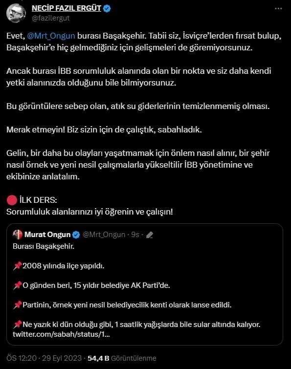 Görüntülerdeki su baskının olduğu alanın İBB'nin sorumluluk alanı olduğunu söyleyen Ergüt, "Evet, Murat Ongun burası Başakşehir. Tabii siz, İsviçre'lerden fırsat bulup, Başakşehir'e hiç gelmediğiniz için gelişmeleri de göremiyorsunuz. Ancak burası İBB sorumluluk alanında olan bir nokta ve siz daha kendi yetki alanınızda olduğunu bile bilmiyorsunuz."