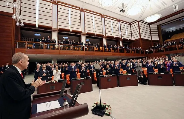"Yeni yasama yılında teklifleriyle, muvafık-muhalif görüşleriyle, temsilcisi oldukları milletle olan yakın irtibatlarıyla, milli iradenin üstünlüğü ilkesine bağlılıklarıyla, bu çatı altında ülkemize, milletimize, şehirlerimize hizmet verecek, katkı verecek tüm milletvekillerimize başarılar diliyorum. Sizlerden, milli ülkümüz olan Türkiye Yüzyılı vizyonuna yakışır fikri ve fiili eserler bekliyoruz. Binlerce yıllık devlet geleneğimizin, iki asrı bulan demokrasi arayışımızın, ilk yüzyılını geride bırakmak üzere olduğumuz Cumhuriyetimizin, çok partili siyasi hayata geçişle birlikte şekillenmeye başlayan demokratik teamüllerimizin, velhasıl göz kamaştırıcı milli hazinemizin en büyük mirası işte burasıdır, bu yüce kurumdur."