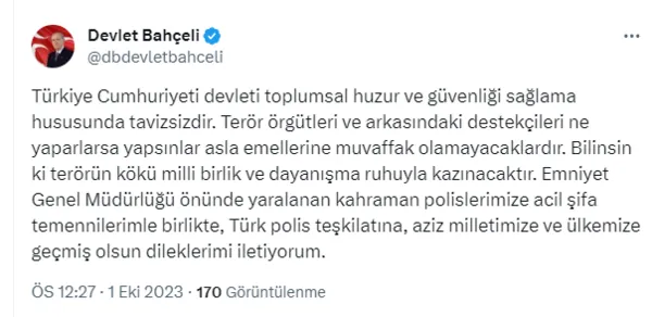 Bahçeli, sosyal medya hesabından yaptığı açıklamada, sabah Emniyet Genel Müdürlüğünü doğrudan hedef alan bombalı terör saldırısını lanetlediğini bildirdi.
