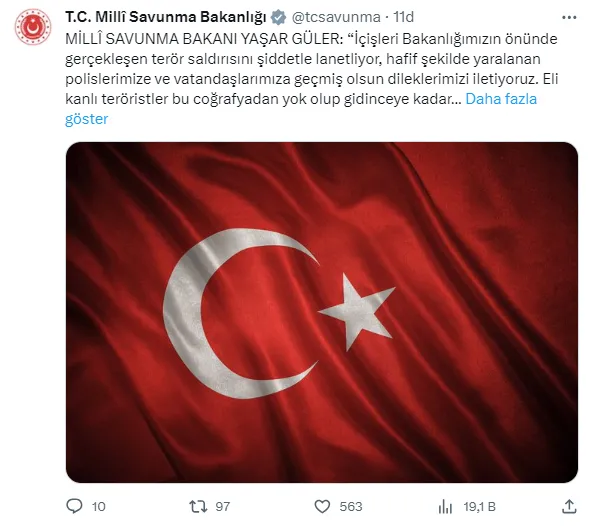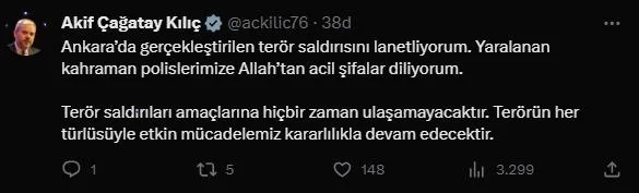 Paylaşımda, "Ankara'da Emniyet Genel Müdürlüğümüze yönelik hain terör saldırısını lanetliyorum. Bu alçak saldırıda yaralanan kahraman polislerimize acil şifalar diliyor, İçişleri Bakanlığımız personeline ve milletimize geçmiş olsun dileklerimi iletiyorum. Terörle mücadelemizi yurt içi ve yurt dışında kararlılıkla sürdüreceğiz." ifadeleri kullanıldı.