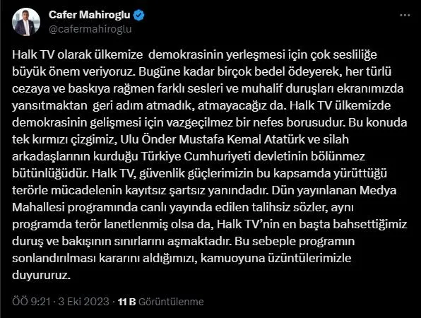 RTÜK'ün açıklamasının ardından açıklamalarda bulunan HALK TV'nin kaçak villa çıkan patronu Cafer Mahiroğlu, programı sonlandırdıklarını açıkladı. Mahiroğlu, "Halk TV olarak ülkemize demokrasinin yerleşmesi için çok sesliliğe büyük önem veriyoruz. Bugüne kadar birçok bedel ödeyerek, her türlü cezaya ve baskıya rağmen farklı sesleri ve muhalif duruşları ekranımızda yansıtmaktan geri adım atmadık, atmayacağız da. Halk TV ülkemizde demokrasinin gelişmesi için vazgeçilmez bir nefes borusudur. Bu konuda tek kırmızı çizgimiz, Ulu Önder Mustafa Kemal Atatürk ve silah arkadaşlarının kurduğu Türkiye Cumhuriyeti devletinin bölünmez bütünlüğüdür. Halk TV, güvenlik güçlerimizin bu kapsamda yürüttüğü terörle mücadelenin kayıtsız şartsız yanındadır. Dün yayınlanan Medya Mahallesi programında canlı yayında edilen talihsiz sözler, aynı programda terör lanetlenmiş olsa da, Halk TV'nin en başta bahsettiğimiz duruş ve bakışının sınırlarını aşmaktadır. Bu sebeple programın sonlandırılması kararını aldığımızı, kamuoyuna üzüntülerimizle duyururuz." ifadelerini kullandı.