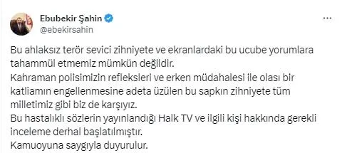 Ebubekir Şahin, X sosyal medya platformundan yaptığı paylaşımda, "Bu ahlaksız terör sevici zihniyete ve ekranlardaki bu ucube yorumlara tahammül etmemiz mümkün değildir. Kahraman polisimizin refleksleri ve erken müdahalesi ile olası bir katliamın engellenmesine adeta üzülen bu sapkın zihniyete tüm milletimiz gibi biz de karşıyız. Bu hastalıklı sözlerin yayınlandığı Halk TV ve ilgili kişi hakkında gerekli inceleme derhal başlatılmıştır." ifadelerine yer verdi.