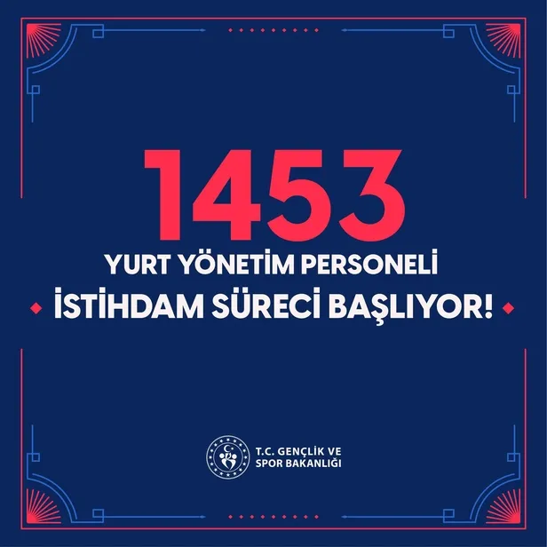 Gençlik ve Spor Bakanı Osman Aşkın Bak sosyal medya hesabından duyurdu. Bakanlık yurtlarında istihdam edilmek üzere 1453 yurt yönetim personeli alınacağını açıkladı.