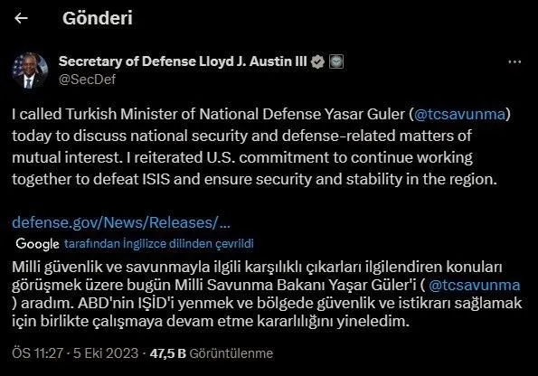 Austin, X sosyal medya hesabından yaptığı paylaşımda, Milli Savunma Bakanı Güler ile telefonda görüştüğünü bildirdi.