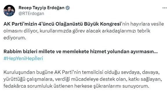 Erdoğan kongreye ilişkin, "AK Parti'mizin 4'üncü Olağanüstü Büyük Kongresi'nin hayırlara vesile olmasını diliyor, kurullarımızda görev alacak arkadaşlarımızı tebrik ediyorum. Rabbim bizleri millete ve memlekete hizmet yolundan ayırmasın... Hep Yeni Hep İleri Kuruluşundan bugüne AK Parti'nin temsilcisi olduğu sevdaya, davaya, yürüttüğü çalışmalara, verdiği mücadeleye destek olan, katkı sağlayan, fedakârca sorumluluk üstlenen herkese şükranlarımı sunuyorum." ifadelerini kullandı.