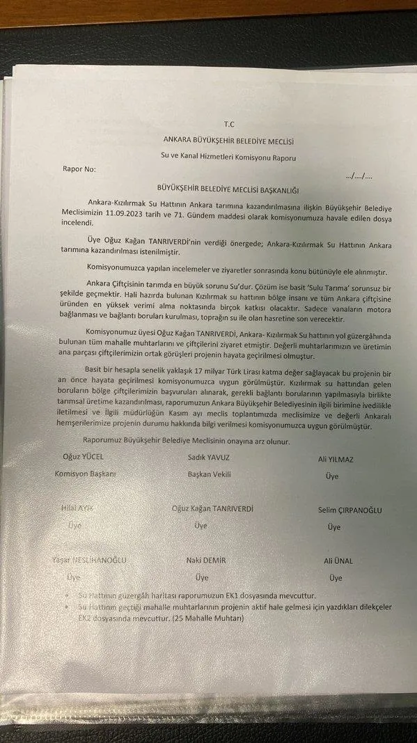 31 Mart seçimleri öncesi Ankaralılara 110 vaatte bulunan Ankara Büyükşehir Belediye Başkanı Mansur Yavaş'ın en dikkat çeken vaadi Ankara'da sulu tarım yapılabileceği vaadiydi. 4 buçuk yıldır görevde olan Yavaş söz konusu vaadi ile ilgili herhangi bir adım atmazken söz konusu projenin hayata geçirilmesine ilişkin ABB Meclis Üyesi Oğuz Kaan Tanrıverdi, ABB Meclisi'ne önerge verdi.