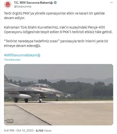 "Terör örgütü PKK'ya yönelik operasyonlar etkin ve kararlı bir şekilde devam ediyor. Kahraman Türk Silahlı Kuvvetlerimiz, Irak'ın kuzeyindeki Pençe-Kilit Operasyonu bölgesinde tespit edilen 6 PKK'lı teröristi etkisiz hâle getirdi. "Terörist neredeyse hedefimiz orası!" parolasıyla terör inlerini yerle bir etmeye devam edeceğiz."