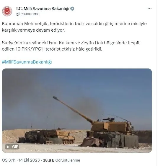 "Kahraman Mehmetçik, teröristlerin taciz ve saldırı girişimlerine misliyle karşılık vermeye devam ediyor. Suriye'nin kuzeyindeki Fırat Kalkanı ve Zeytin Dalı bölgesinde tespit edilen 10 PKK/YPG'li terörist etkisiz hale getirildi."