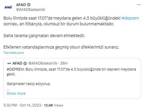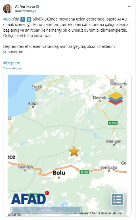 Bolu ilinde meydana gelen 4.5 şiddetindeki depremin ardından AFAD konuya ilişkin, "Bolu ilimizde saat 17.07'de meydana gelen 4.5 büyüklüğündeki deprem sonrası, an itibarıyla, olumsuz bir durum bulunmamaktadır. Saha tarama çalışmaları devam etmektedir. Etkilenen vatandaşlarımıza geçmiş olsun dileklerimizi sunarız." şeklinde açıklama yaptı.