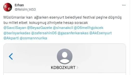 Erhan isimli bir başka sosyal medya kullanıcısı ise, "Müslümanlar kan ağlarken Esenyurt Belediyesi festival peşine düşmüş. Bu millet elbet kokuşmuş zihniyete hesap soracak" dedi.