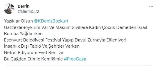 Berrin isimli bir diğer X sosyal medya kullanıcısı, "Yazıklar olsun Deniz Bozkurt. Gazze'de soykırım var ve masum sivillere kadın çocuk demeden İsrail bomba yağdırırken Esenyurt Belediyesi festival yapıp davul zurnayla eğleniyor! İnsanlık dışı tablo ve şehitler varken nefret ediyorum evet ben de bu çağdan etimle kemiğimle" dedi.