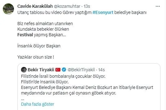 X sosyal medya kullanıcısı Bekir Tiryaki, yaptığı paylaşımda, Esenyurt Belediye Başkanı Kemal Deniz Bozkurt'un halay çektiği videoyu paylaşarak, "Filistinde İsrail bombalarıyla çocuklar ölüyor. Filistin'de insanlık ölüyor. Esenyurt Belediye Başkanı Kemal Deniz Bozkurt an itibariyle Esenyurt meydanında vur patlasın çal oynasın göbek atıyor. Ben bu çağdan nefret ettim. Etimle, kemiğimle nefret ettim" ifadelerine yer verdi.