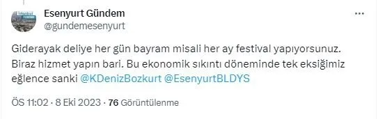 Esenyurt Gündem isimli bir sosyal medya kullanıcısı, "Giderayak deliye her gün bayram misali her ay festival yapıyorsunuz. Biraz hizmet yapın bari. Bu ekonomik sıkıntı döneminde tek eksiğimiz eğlence sanki" paylaşımında bulundu.