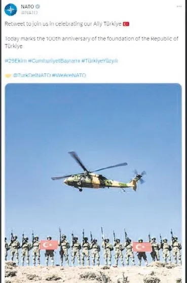 NATO, Türkiye Cumhuriyeti'nin kuruluşunun 100. yılını kutladı. Türk bayrağı açmış Mehmetçikler'in fotoğrafına da yer verilen paylaşımda "Siz de müttefikimiz Türkiye'yi kutlarken bize katılın" ifadesi kullanıldı.