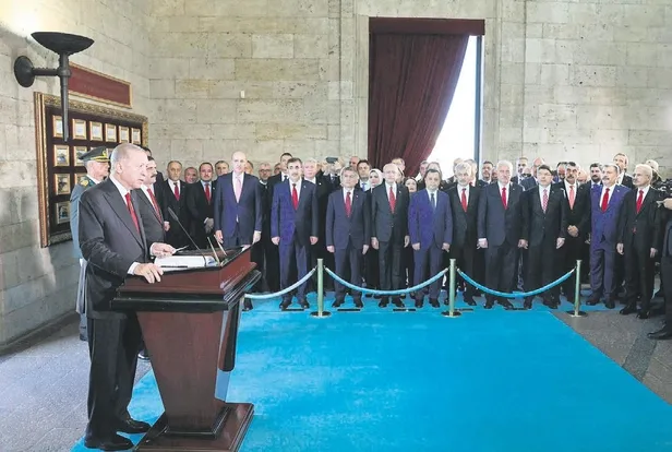 Başkan Erdoğan liderliğindeki devlet erkanı, Atatürk'ün mozolesine çelenk bıraktı. Erdoğan, Anıtkabir Özel Defteri'ne şu mesajları yazdı: