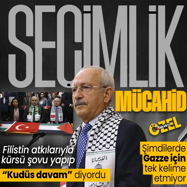 Seçimlik 'Mücahid' Kemal Kılıçdaroğlu, yerel seçim ve kurultaya giderayak birden Filistin ve Gazze'yi hatırladı. Başkan Recep Tayyip Erdoğan ve hükümetin Gazze için seferber oluşunu görmezden gelip Büyük Filistin Mitingi'ni karalamaya çalışan Kılıçdaroğlu, "Ey Erdoğan, iktidarı bize devret Filistin sorunu nasıl çözülürmüş göreceksin. Orta Doğu'ya barış ve huzur nasıl gelecekmiş göreceksin o zaman" sözleriyle rol çalmak istedi. Rusya - Ukrayna savaşında Kiev'den yana saf tutup "Savaşta taraf olalım" mesajı veren Kılıçdaroğlu hakkında "Filistin sorununu da İsrail'e teslim olarak çözer" yorumları yapıldı.