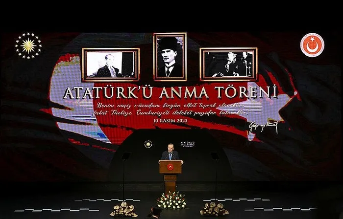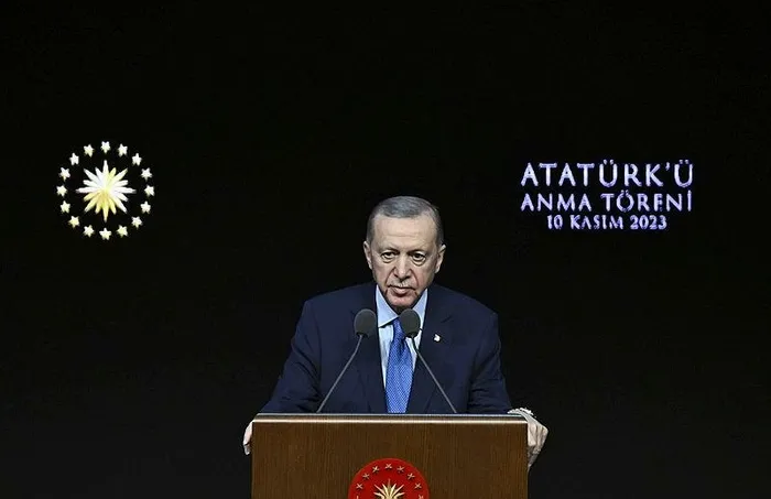 Başkan Recep Tayyip Erdoğan, Anıtkabir'deki resmi tören sonrası Dil Tarih Kurumu'nun düzenlediği Atatürk'ü anma töreninde konuştu. "Gazi Mustafa Kemal'in vasiyeti olan ülkemizi muhasır medeniyet seviyesinin üzerine çıkarma mücadelesini milli mücadele ruhuyla sürdürüyoruz" diyen Erdoğan, "Türkiye dün gardırop Atatürkçüleri bugün de sosyal medya Atatürkçülerinden çok çekmiştir" ifadelerini kullandı. İsrail'in Gazze'deki işlediği katliamlara sert tepki gösteren Erdoğan, "Ülkemiz topraklarını da içeren vadedilmiş topraklar hezeyanıyla, nükleer silah kullanma tehditleriyle sabrımızı zorluyorlar" dedi. AYM ve Yargıtay arasındaki çatışmayı da değerlendiren Erdoğan, "Yeni anayasa talebinin haklılığının göstergesi. Biz bu tartışmada taraf değil hakem konumundayız!" şeklinde konuştu.