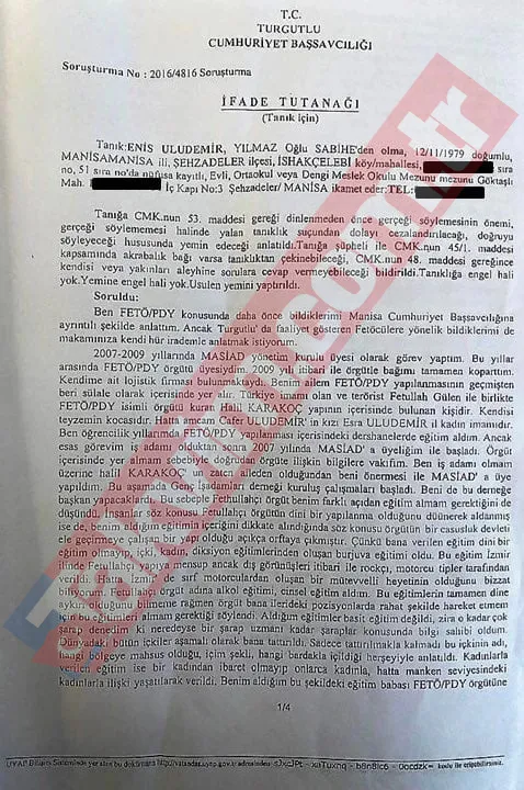 Manisa Cumhuriyet Başsavcılığı'na daha önce ildeki FETÖ'nün işadamı yapılanması hakkında bildiklerini anlatan Enis Uludemir, 31 Ekim 2016 günü de kendiliğinden Turgutlu Cumhuriyet Savcılığı'na gelerek FETÖ'nün Turgutlu ilçesindeki işadamı örgütlenmesi ve siyasetçilerle ilişkisiyle ilgili ayrıntıları itiraf etti.