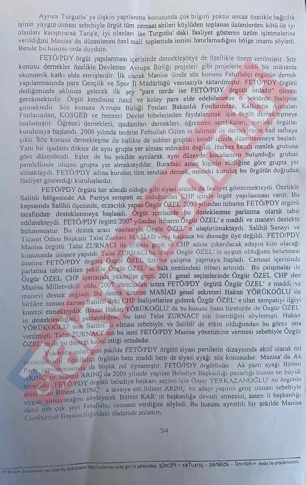 2007 sürecinden sonra FETÖ/PDY örgütü Özgür Özel'e maddi ve manevi destek sağladı. Bu destek üzerine MASİAD Genel Sekreteri Hakan Yörükoğlu ile birlikte zaman zaman Salihli'deki CHP faaliyetlerine giderek Özgür Özel'e olan sempatiyi, ilgili kontrol etmeliydik. Bizzat Hakan Yörükoğlu da bana birebir Özgür Özel'in desteklendiğini, parlatıldığını, bu ismi Talat Zurnacı'nın önerdiğini söylemişti." dedi.