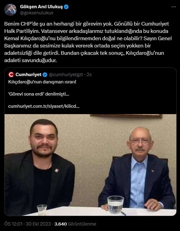 Eski Zafer Partili Gökşen Anıl Ulukuş, daha evvel Kılıçdaroğlu'na danışman olarak atandığını duyurmuş, ancak önceki paylaşımlarında Sezgin Tanrıkulu'na hakaretler ettiği ortaya çıkınca CHP'lilerin hedefi olmuştu.